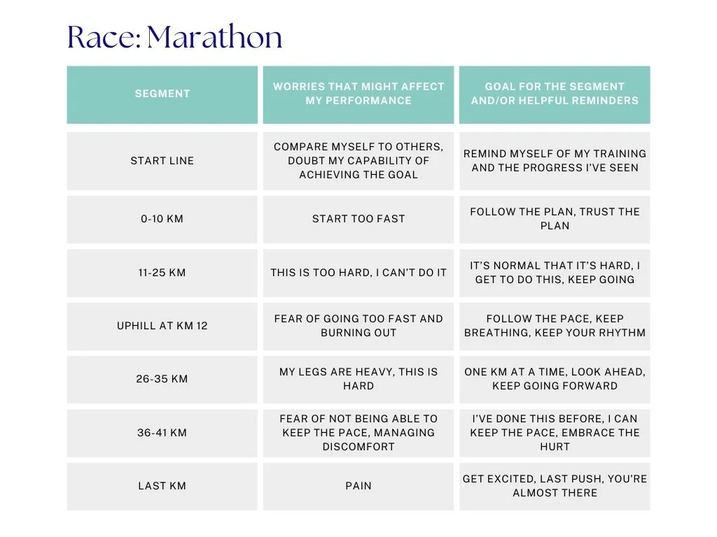 Luckily we can use an exercise called Segmentation where we can build coping strategies that will help us manage negative thoughts as they come up on race day. The idea is that if you prepare how you’ll shift your inner voice, you’ll most likely be able to do it a little bit better next time you race. In the midst of challenging situations we let our emotions take over - we react. Having a mental plan already set up means you’ll have access to tools or mindset shifts you can grab right away, and not have to try to make them up on the spot. At kilometer 32 do you think you’ll have the energy to come up with a mindset shift to help you get out of your spiral? Most probably not (but kudos if you do!), as these things have to be practiced and planned for. In moments of fatigue the brain defaults to habit, and so worries, doubts and fears can trickle in without invitation.