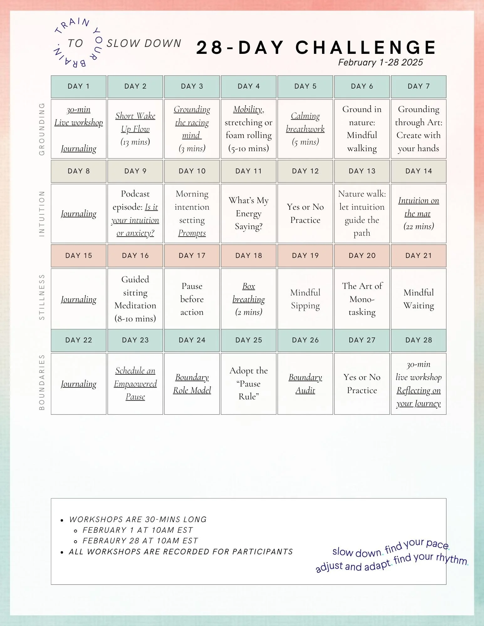 Each week, dive into a new theme designed to help you slow down, from mindfulness and movement to journaling and self-reflection. I will be sending a video on Week 2, 3, and 4 to explain the exercises of the week.